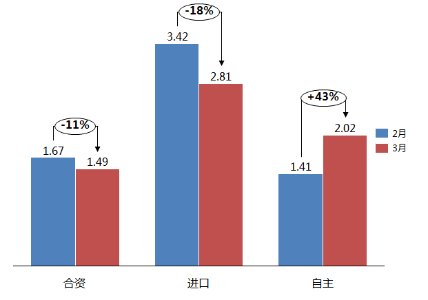 3月份,合資、進口品牌庫存系數均有不同程度的下降,自主品牌的庫存系數上升。合資品牌庫存系數由上月1.67降至1.49,環比下降11%,接近預警線;進口品牌庫存系數由上月的3.42降至2.81,環比下降18%,進口品牌庫存水平有所下降;自主品牌庫存系數由上月的1.41升至2.02,環比上升43%,1-2月份自主品牌經銷商的銷售量大于進貨量,經銷商庫存壓力不大。3月份廠家補充庫存,庫存量有所增加,庫存壓力有所上升。