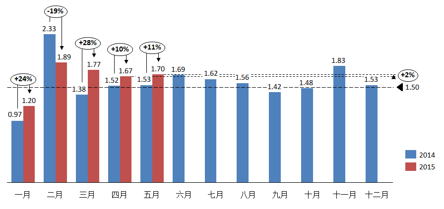 2015年5月份汽車經(jīng)銷商庫存系數(shù)為1.70