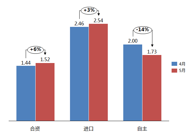 5月份,合資、進口品牌庫存系數(shù)均有不同程度的上升,自主品牌庫存系數(shù)有所下降。合資品牌庫存系數(shù)由上月1.44升至1.52,環(huán)比上升6%,處于警戒線以上,;進口品牌庫存系數(shù)由上月的2.46升至2.54,環(huán)比上升3%,庫存水平仍處于高位;自主品牌庫存系數(shù)由上月的2.00降至1.73,環(huán)比下降14%,5月份,部分合資品牌的降價促銷力度加大,但收效甚微。而且合資品牌的產品結構以轎車為主,隨著轎車市場的萎縮,合資品牌市場銷量下滑,經(jīng)銷商經(jīng)營壓力加大。而自主品牌銷量增加明顯。