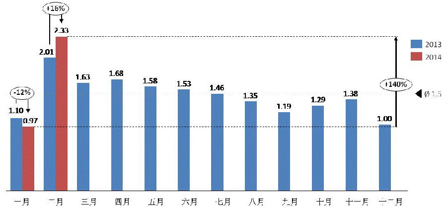 2014年3月20日,中國汽車流通協會對外發布2014年2月份“汽車經銷商庫存調查結果”。2月份經銷商綜合庫存系數為2.33,環比上升140%,同比上升16%(見圖1)。