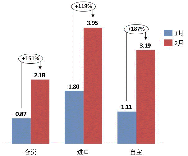 受春節因素影響,2月我國汽車產銷比1月正常回落。今年2月汽車產銷分別為163.75萬輛和159.64萬輛,比上月分別下降21.7%和26.0%,比上年同期分別增長21.5%和17.8%。