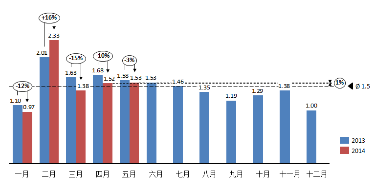 2014年6月20日,中國汽車流通協會對外發布2014年5月份“汽車經銷商庫存調查結果”。5月份經銷商綜合庫存系數為1.53,環比上升1.0%,同比下降3.0%(見圖1)。