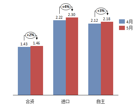 5月全國汽車產銷分別為197.58萬輛和191.12萬輛,產銷環比分別下降4.44%和4.64%;同比分別增長10.97%和 8.50%。5月份產銷量較4月有所回落,與去年同期相比保持增長態勢。其中,包括合資自主品牌在內,自主品牌乘用車銷量45.23萬輛,較去年同期的41.17萬輛增長9.9%,增幅低于乘用車平均增幅的16.4%。在乘用車市場的占有率再度同比下跌,已連續9個月同比下滑。自主品牌的市場前景不容樂觀,經銷商庫存水平依然在2.0以上。因此,車企及經銷商需保持謹慎態度,合理控制自主品牌庫存。