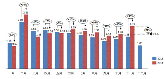 2014年12月20日,中國汽車流通協會對外發布2014年11月份“汽車經銷商庫存調查結果”。11月份汽車經銷商綜合庫存系數為1.83,環比上升24%,同比上升33%,經銷商庫存大幅度增加(見圖1)。