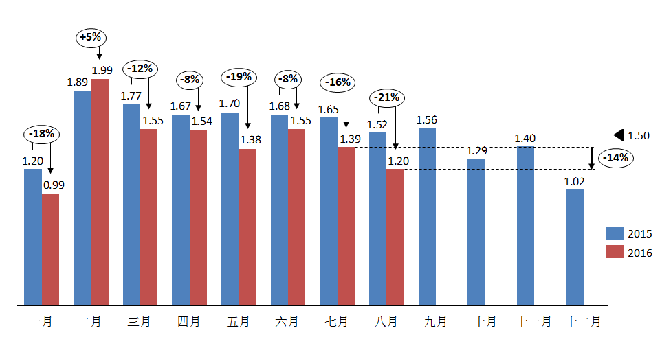 2016年8月份經(jīng)銷商庫存系數(shù)為1.20