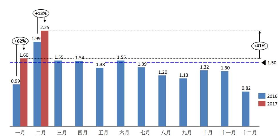2017年2月份經銷商庫存系數為2.25