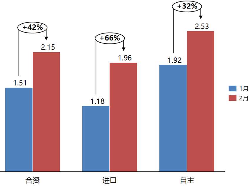 2月份,合資品牌、進口品牌和自主品牌的庫存系數相比上月均有所上升。合資品牌庫存系數為2.15,環比上升42%;進口品牌庫存系數為1.96,環比上升66%;自主品牌庫存系數為2.53,環比上升32%。2月,合資品牌、進口品牌和自主品牌庫存水平均位于警戒線以上。