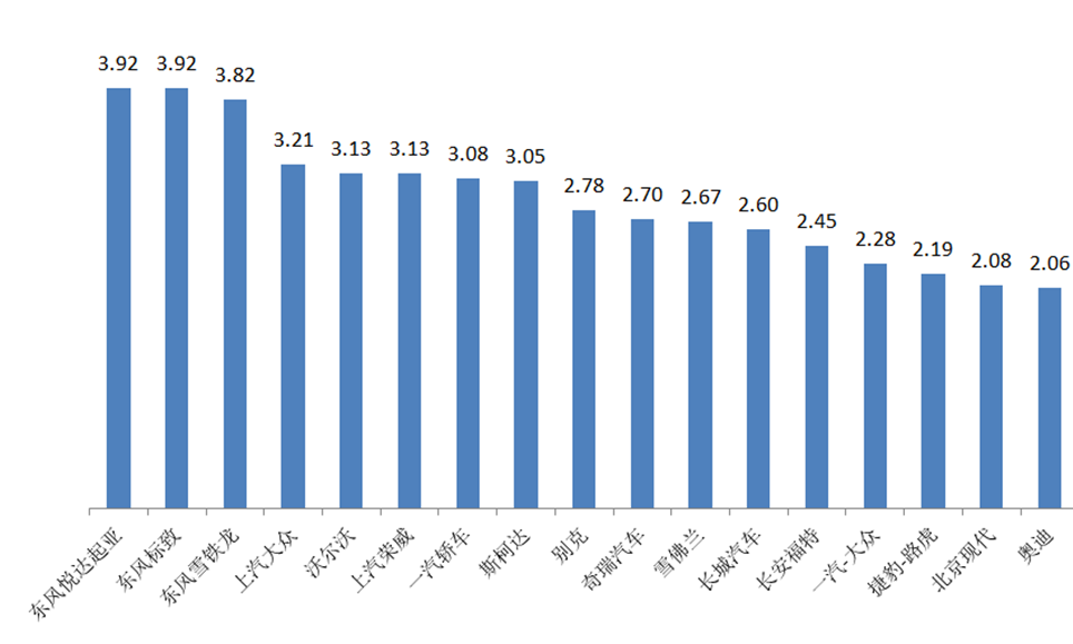 2月,17個品牌庫存深度在兩個月以上,分別是:東風悅達起亞、東風標致、東風雪鐵龍、上汽大眾、沃爾沃、上汽榮威、一汽轎車、斯柯達、別克、奇瑞汽車、雪佛蘭、長城汽車、長安福特、一汽-大眾、捷豹路虎、北京現代、奧迪。
