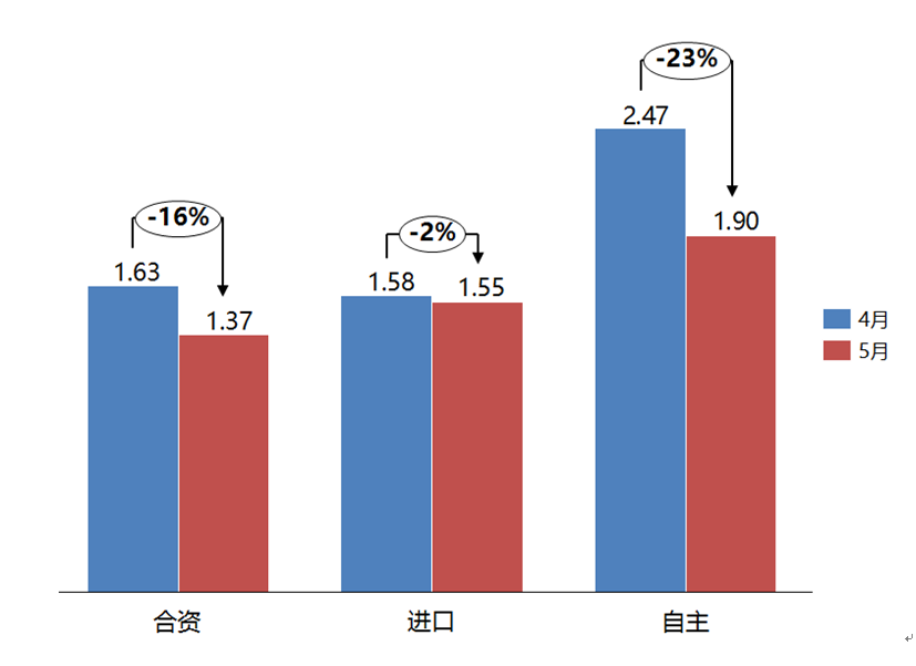 5月份,合資品牌、進口品牌和自主品牌的庫存系數相比上月均有所下降。合資品牌庫存系數為1.37,環比下降16%;進口品牌庫存系數為1.55,環比下降2%;自主品牌庫存系數為1.90,環比下降23%。5月,進口品牌和自主品牌庫存水平位于警戒線以上。