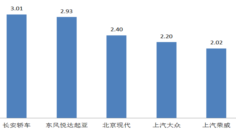 5月,5個品牌庫存深度在兩個月以上,分別是:長安轎車、東風悅達起亞、北京現代、上汽大眾、上汽榮威。