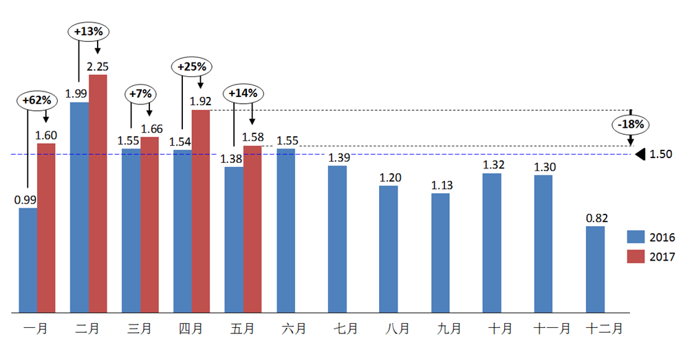 2017年5月汽車經銷商庫存系數為1.58