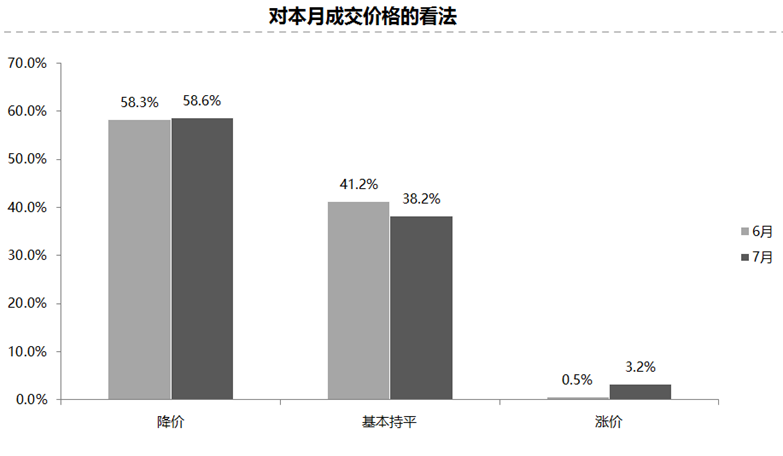 調查結果顯示,認為7月份成交價格下降的經銷商比例為58.6%;認為漲價的比例為3.2%;認為成交價格與上月基本持平的比例為38.2%。
