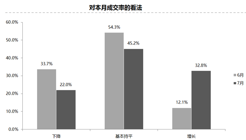 調查結果顯示,認為7月成交率增長的比例為32.8%;認為下降的比例為22.0%;認為基本持平的比例為45.2%。