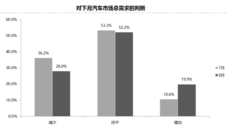 經銷商預計8月份市場需求比7月減少,認為市場需求“增加”的經銷商比例為19.9%;認為市場需求“減少”的比例為28.0%;認為市場需求“持平”的比例為52.2%。