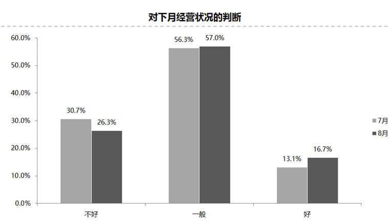 經銷商預計8月份經銷商經營狀況不好。調查顯示,認為8月份經營狀況“好”的比例為26.3%,認為“不好”的比例為16.7%;認為經營狀況“一般”的比例為57.0%。