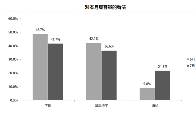 調查結果顯示,7月份集客量下降,認為7月份集客量下降的經銷商比例為41.7%;認為增長的比例為21.8%;認為集客量基本持平的比例為36.6%。