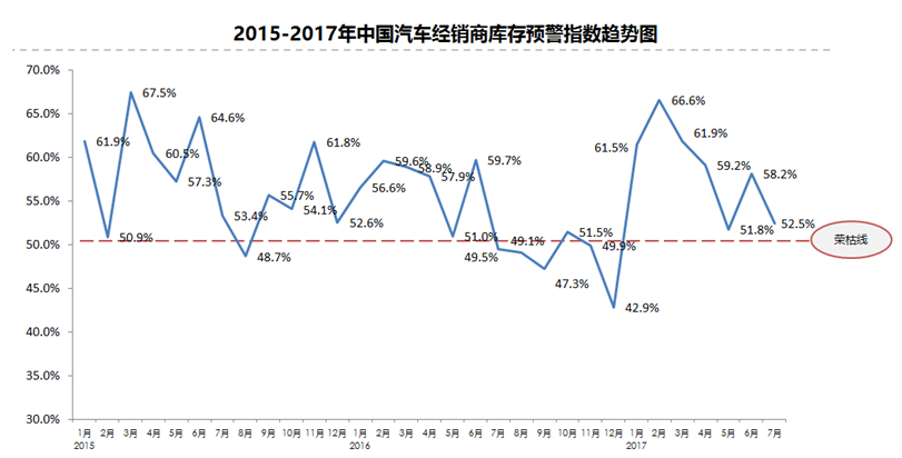 中國汽車流通協會發布的“中國汽車經銷商庫存預警指數調查”VIA(Vehicle Inventory Alert Index)顯示,2017年7月庫存預警指數為52.5%,比上月下降5.7個百分點,位于警戒線以上。