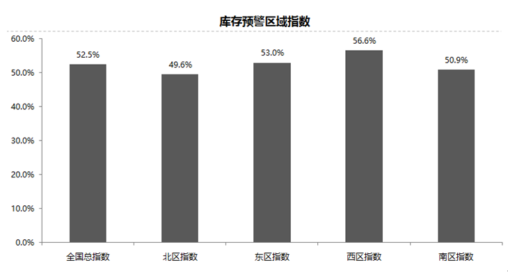 從區域指數情況看:7月份全國總指數為52.5%,北區指數為49.6%,東區指數為53.0%,西區指數為56.6%,南區指數為50.9%。由于北部區域的吉林省、黑龍江省等地區在7月份均有大型國際車展,刺激了當地市場需求,所以,7月北部區域的庫存預警指數最低。