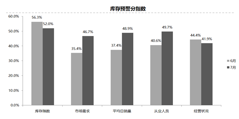 從分指數情況看:7月份庫存分指數環比微降,仍位于警戒線以上;市場需求分指數、平均日銷量分指數、從業人員分指數環比上升,經營狀況分指數環比下降。7月,庫存指數為52.0%,市場需求指數為46.7%,平均日銷量指數為48.9%,從業人員指數為49.7%,經營狀況指數為41.9%。