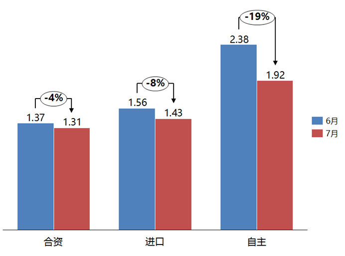 7月份,合資品牌、進口品牌和自主品牌庫存系數(shù)相比上月下降。合資品牌庫存系數(shù)為1.31,環(huán)比下降4%;進口品牌庫存系數(shù)為1.43,環(huán)比下降8%;自主品牌庫存系數(shù)為1.92,環(huán)比下降19%。7月,自主品牌庫存水平依然位于警戒線以上。