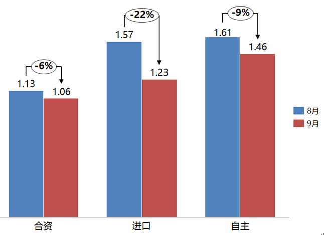 9月份,合資品牌、自主品牌、進(jìn)口品牌庫(kù)存系數(shù)相比上月下降。合資品牌庫(kù)存系數(shù)為1.06,環(huán)比下降6%;自主品牌庫(kù)存系數(shù)為1.46,環(huán)比下降9%;進(jìn)口品牌庫(kù)存系數(shù)為1.23,環(huán)比下降22%。9月,經(jīng)銷商的庫(kù)存壓力相比8月有所緩解。