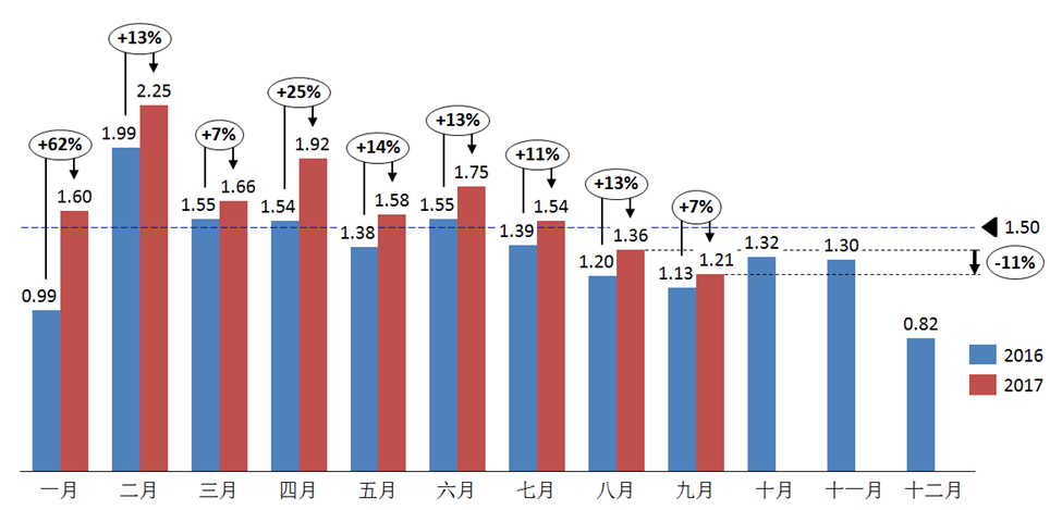 2017年9月汽車經(jīng)銷商庫(kù)存系數(shù)為1.21