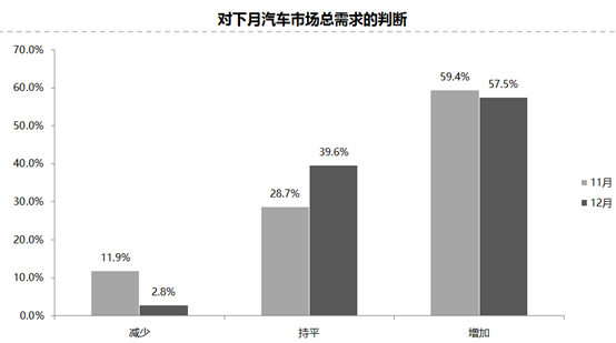 預計12月份市場需求比11月增加,認為市場需求“增加”的經銷商比例為57.5%;認為市場需求“減少”的比例為2.8%;認為市場需求“持平”的比例為39.6%。