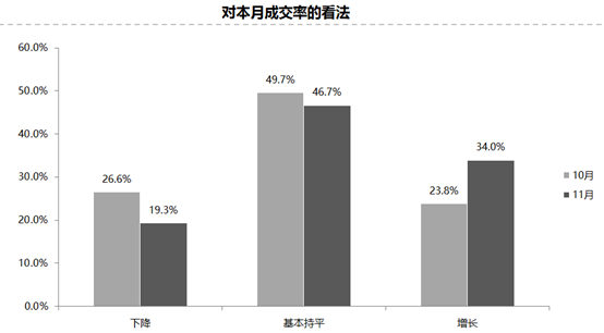 調查結果顯示,認為成交率增長的比例為34%;認為下降的比例為19.3%;認為基本持平的比例為46.7%