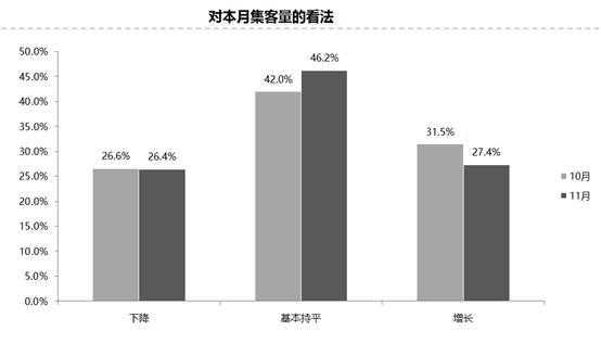 11月份集客量跟上月基本持平,認為11月份集客量下降的經銷商比例為26.4%;認為增長的比例為27.4%;認為集客量基本持平的比例為46.2%。