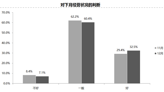 預計12月份經銷商經營狀況好轉。調查顯示,認為12月份經營狀況“好”的比例為32.5%,認為“不好”的比例為7.1%;認為“一般”的比例為60.4%。
