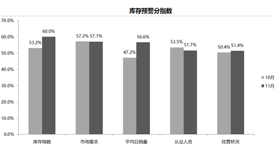 從分指數情況看:11月份庫存分指數和平均日銷量分指數相比上月大幅上升;市場需求分指數與上月基本持平;從業人員分指數相比上月下降,經營狀況分指數相比上月略微上升。