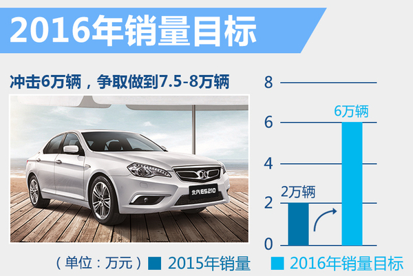 數(shù)據(jù)顯示,2015年北汽新能源銷量達(dá)2萬輛,今年北汽新能源將投放五款新車,銷量目標(biāo)也有很大的提升,年內(nèi)將沖擊6萬輛銷量目標(biāo),爭取做到7.5-8萬輛的成績單。從今年北汽新能源公布的銷量目標(biāo)來看,企業(yè)對年內(nèi)投放的多款新車充滿信心。