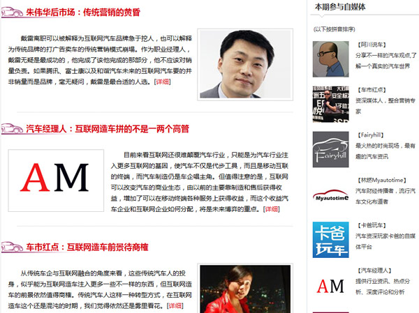 1月29日,搜狐汽車與SA汽車行業(yè)自媒體聯(lián)盟聯(lián)合推出的精品欄目“車聞解碼”正式上線,首期欄目由搜狐汽車編輯部與朱偉華后市場(chǎng)、車市紅點(diǎn)、AM汽車經(jīng)理人、Fairyhill、阿川說車、小拉車、Myautotime以及卡爸玩車等8位知名自媒體人共同打造,針對(duì)時(shí)事熱點(diǎn)進(jìn)行多角度深度解讀?!败嚶劷獯a”的推出,標(biāo)志著搜狐汽車”專業(yè)編輯+PGC”內(nèi)容生態(tài)平臺(tái)的進(jìn)一步完善和深化,也意味著SA汽車行業(yè)自媒體聯(lián)盟向?qū)I(yè)內(nèi)容生產(chǎn)組織的轉(zhuǎn)變和進(jìn)化,上線后在業(yè)內(nèi)引起了良好的反響。