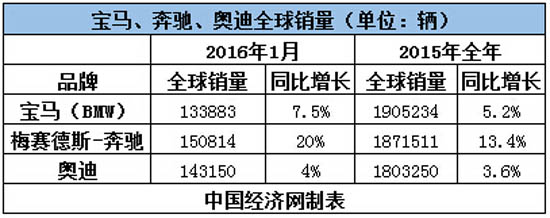 1月,奔馳品牌在全球實現銷售150814輛,超過第二名奧迪7664輛;同比增長20%,相比2014年同期增速15.4%,又上升了4.6個百分點;連續第二個月奪得單月銷量冠軍。