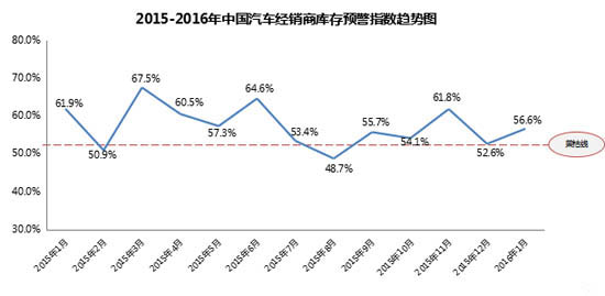 在剛剛過去的1月份,庫存預警指數為56.6%,比上月上升了4.0個百分點。盡管仍處于警戒線以上,但由于1月份經銷商銷售任務較為合理,庫存消化情況較好。
