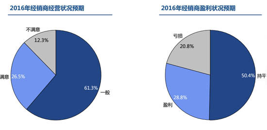 據介紹,2015年,有29.6的經銷商對經營狀況不滿意,相比2014年增加了7.0個百分點,僅有20.2%的經銷商對經營狀況滿意。有48.5%的經銷商盈利狀況為持平,21.8%的經銷商盈利,29.7%的經銷商處于虧損狀態。有26.5%的經銷商預計2016年的經營狀況滿意。有28.8%的經銷商認為2016年盈利,認為虧損的比例僅有兩成。