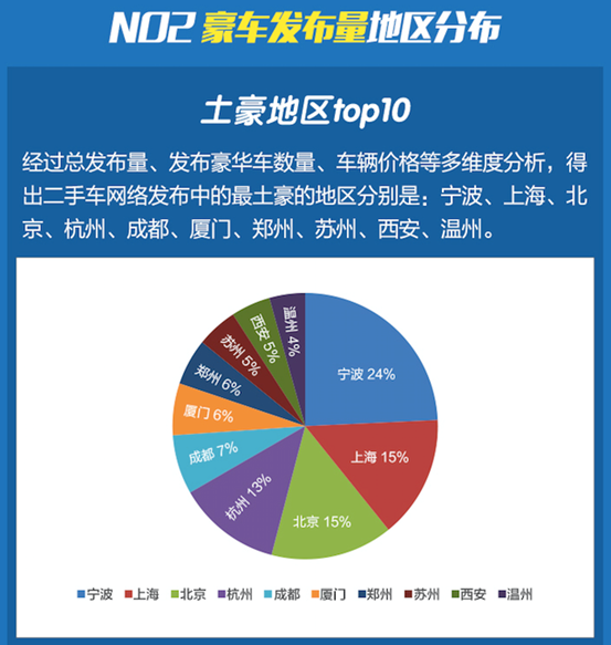 與9月相比,10月豪車發(fā)布量城市前三名無變化,一直以來都是被寧波、上海、北京承包。10個(gè)城市中,絕大部分為南方城市,可見南方豪車數(shù)量相比北方城市較多。這與各地的經(jīng)濟(jì)水平有直接關(guān)系。